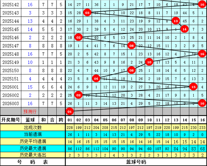 蓝球分析(界说:01-04为一区,05-08为二区,09-12为三区,13-16为四区):上期蓝球开出四区号码16,最近10期蓝球四区落号比为3:2:1:4,总体上三区蓝球较少,四区蓝球推崇较热,本期蓝球看好在第一区开出,独蓝参考01。