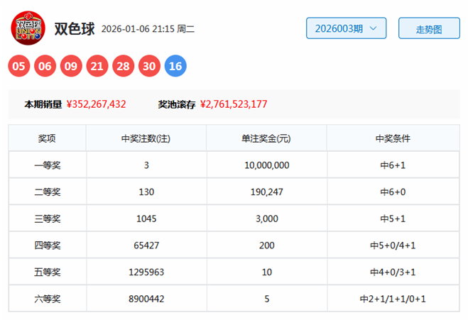 双色球第2026003期开出奖号:红球05、06、09、21、28、30,蓝球16。当期红球三区比为3:1:2,奇偶比为3:3,和值为99,跨度为25,蓝球在第四区开出。
