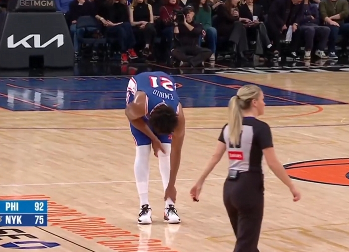 那处造不了犯规!恩比德上篮倒出场外小崴一下 影相师躲皆没躲开
