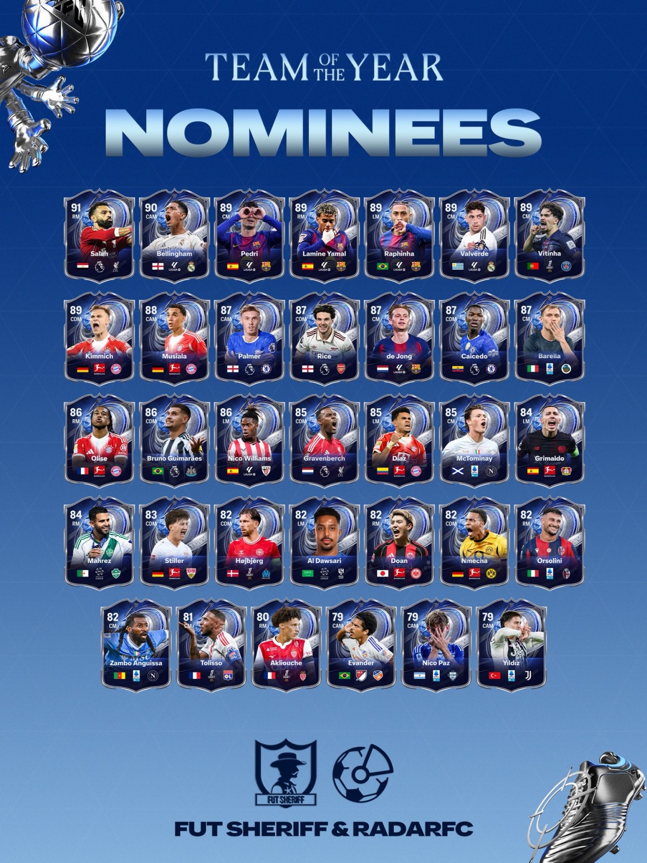EAFC26年度蓝候选:27名时尚含梅罗,亚马尔拉菲萨拉赫被列为中场