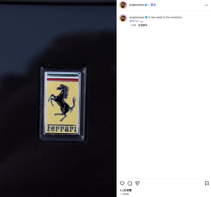 新年提新车!拉莫斯晒新车法拉利,价钱超50万欧