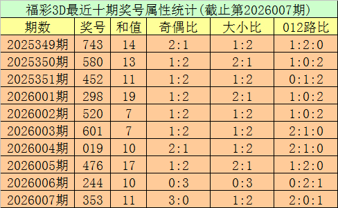 开奖追思:第2026007期福彩3D奖号为353。奖号情势为组三,大小比为1:2,和值为11,奇偶比为3:0,012路比为2:0:1,跨度为2。